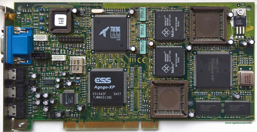 PowerVR PCX2 chip for 3D, Tseng ET6100 for 2D, ESS Agogo-XP PCI bridge and sound chip.