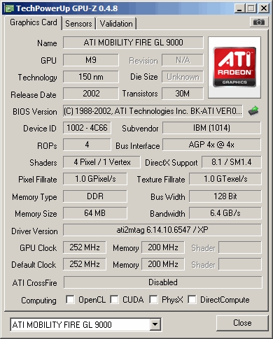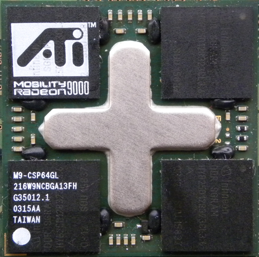 ATi M9-CSP64GL - Mobility Radeon 9000 mostly found in ThinkPads T40p, has 64MB DDR 400MHz memory on BGA package connected with 128-bit bus for space saving. This card is sometimes detected as ATi FireGL 9000, its same as normal mobile Radeon 9000, it does have more OpenGL optimized driver.